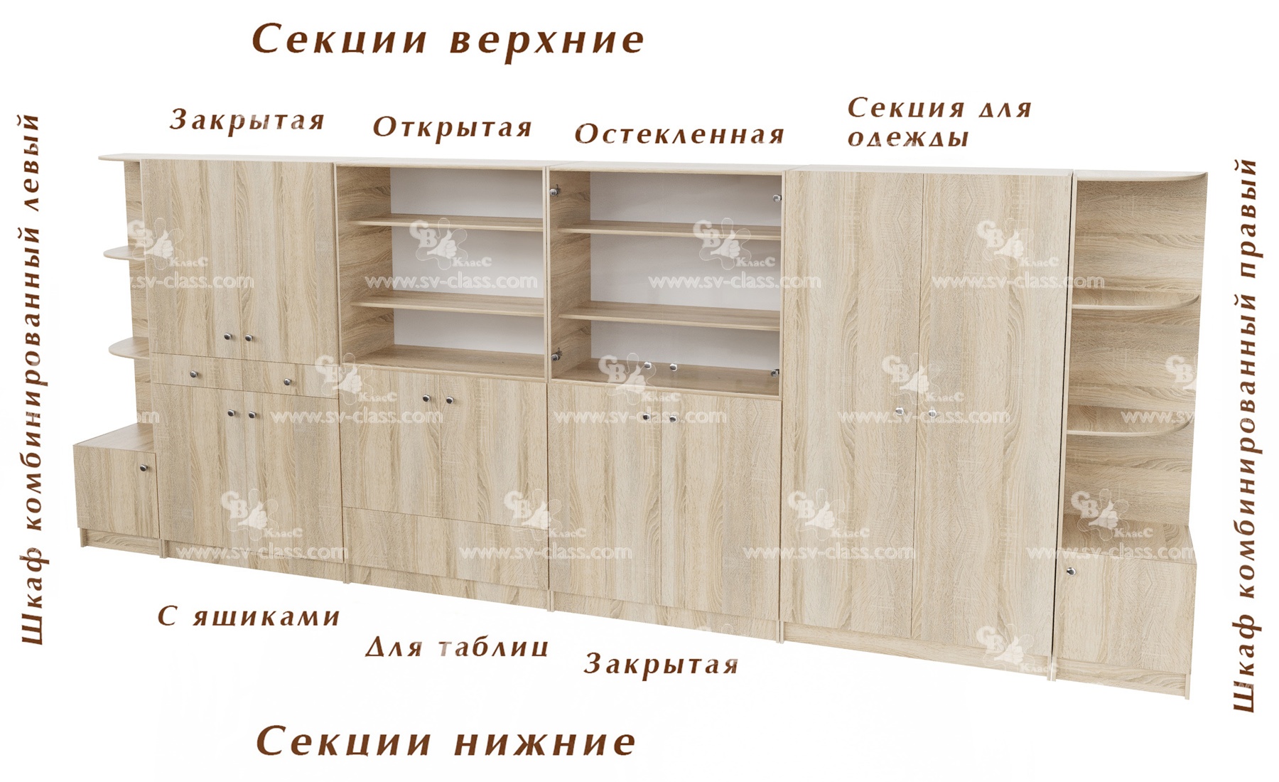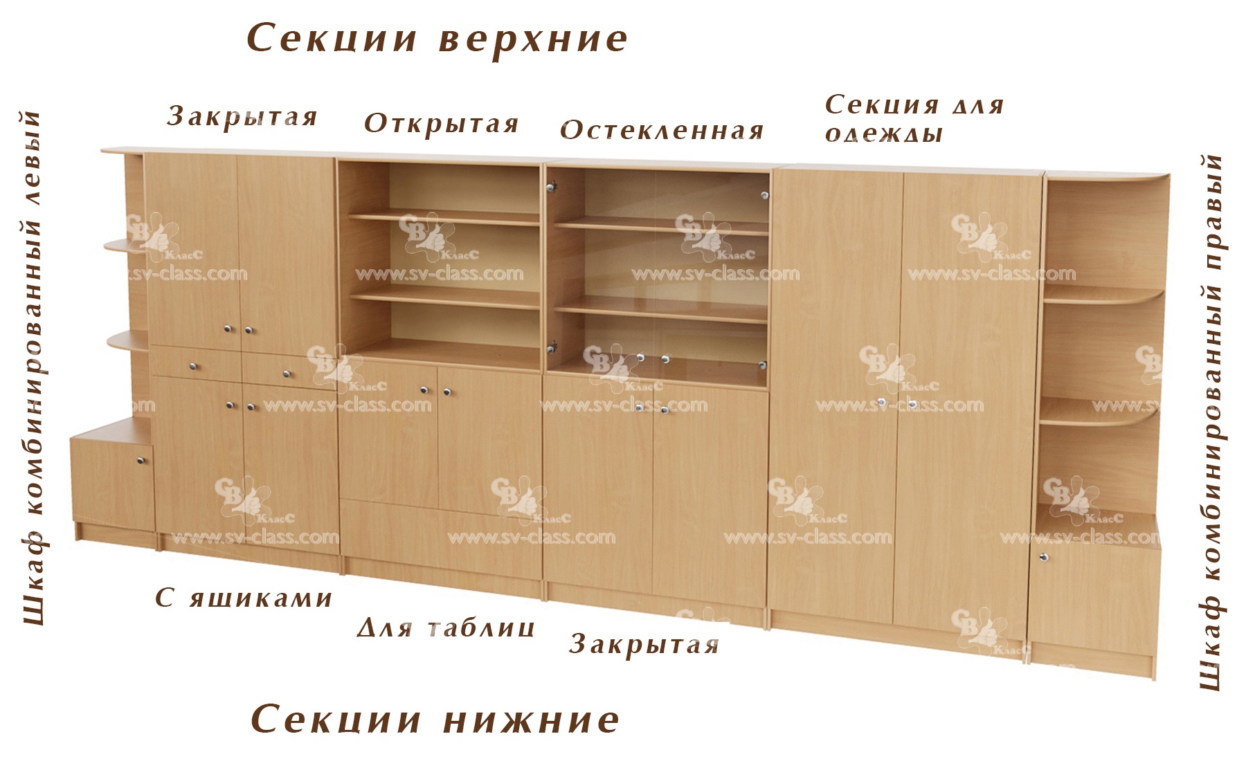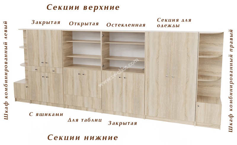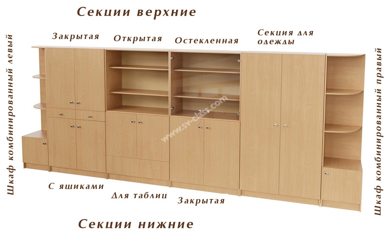 Модульная система шкафов комбинированных включает в себя семь отдельных модулей (секций). Комбинируя типы и количество секций, можно создавать самые разнообразные модели шкафов (двухъярусных и трехъярусных).